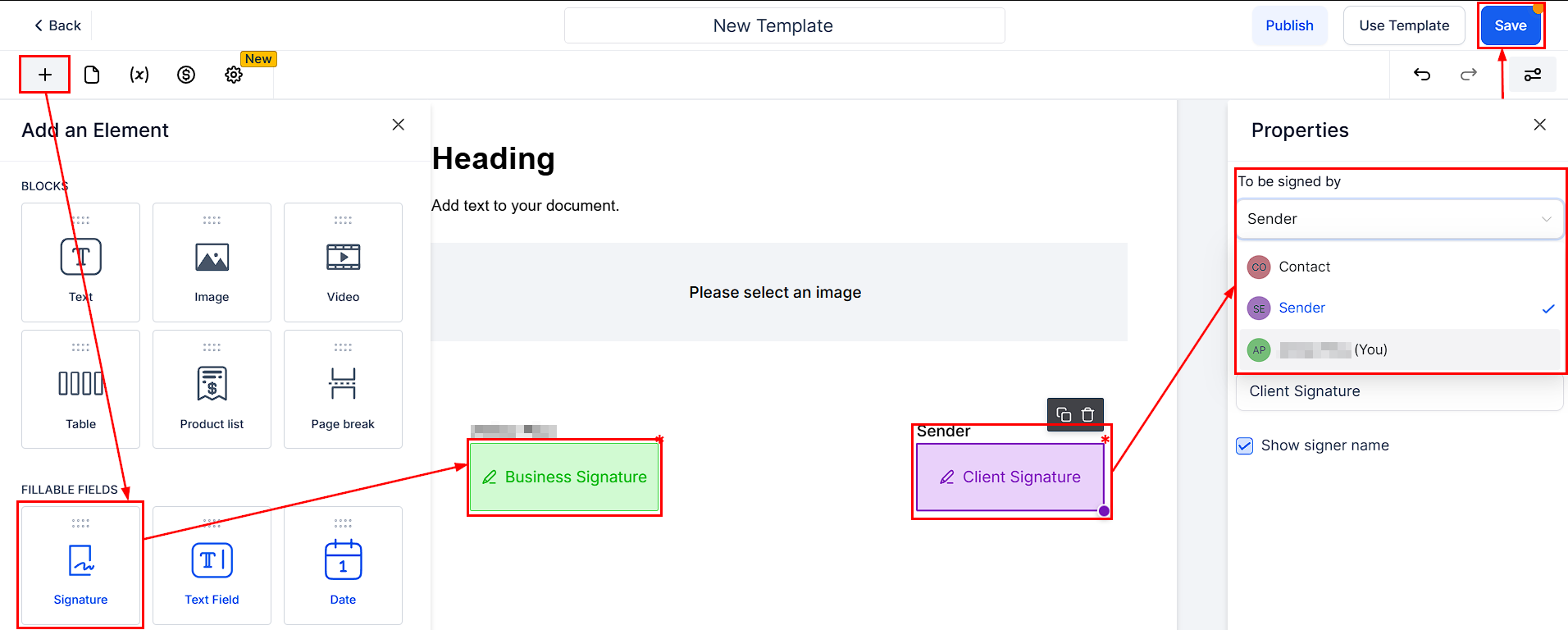 Templates allow you to predefine signature fields, ensuring a smooth signing process for both your team and potential clients. Inside the template editor, drag and drop the Signature Field to the editor workspace and assign signature fields. You can assign the following;
