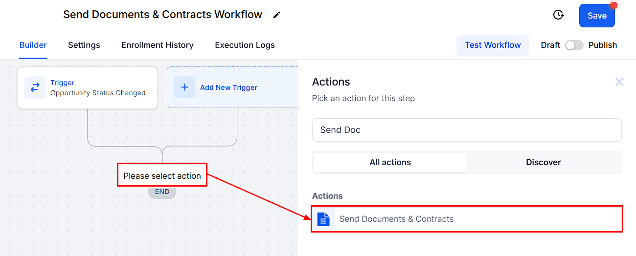 You can also make use of the same templates created to automatically send documents & contracts inside a workflow. This fulfills use cases like automatically sending documents & contracts after opportunity status is changed, or a tag is attached to a contact, or using any other trigger.