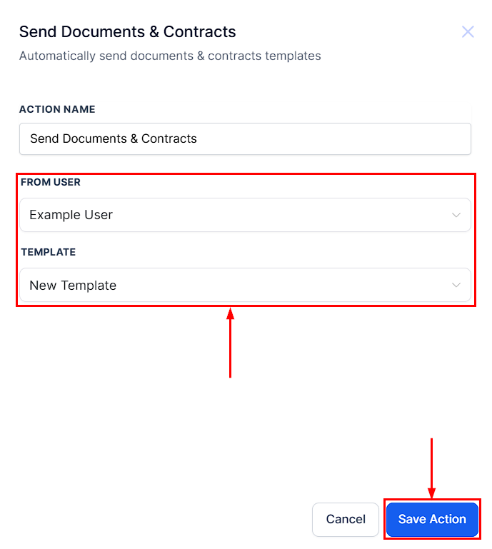 Within the action, select the From User and the Template you created. The default/custom template configured inside the documents & contracts settings will be used automatically to send the document from workflows as well. Remember to Save the Action and Publish the workflow to automate documents & contract delivery.