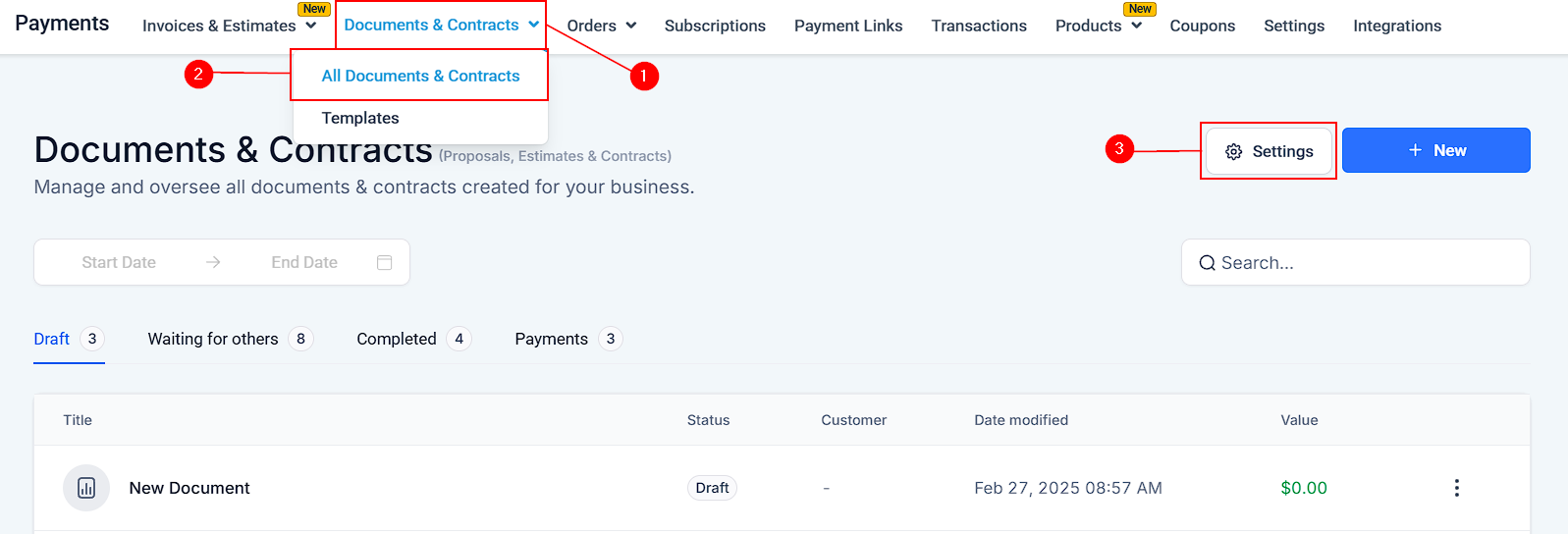 Hover on the Documents & Contracts dropdown and click on All Documents & Contracts, then head to the Settings page.