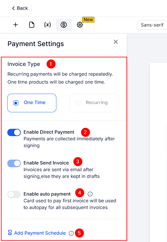 - Enable Auto Payment: When this option is enabled, the card used to pay the first invoice will be automatically charged for all future invoices in the payment schedule. This is useful for subscription-based or installment payments.
