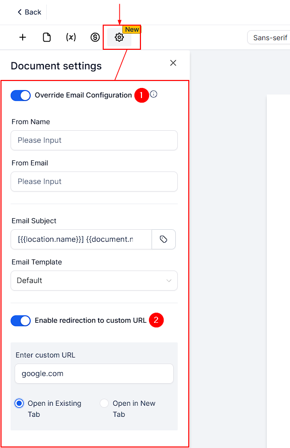 - Override Email Configuration: When this toggle is enabled, it allows users to customize the email settings for sending documents. The available fields include:From Name: The sender's name that will appear in the email.From Email: The sender's email address.Email Subject: A dynamic field where placeholders like
