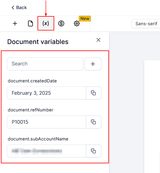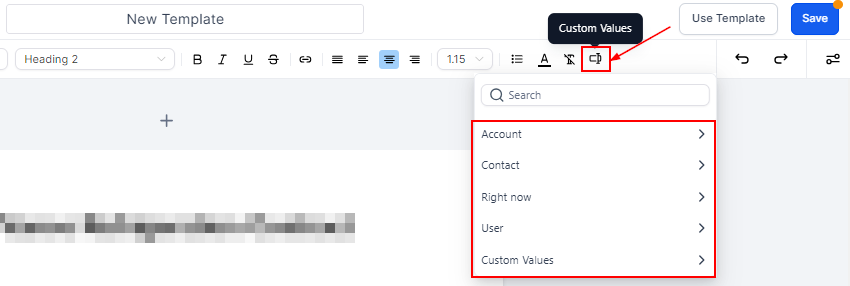 On the top right side of the template builder, you will find the Custom Values Icon. Use this to add already created custom values to the template.