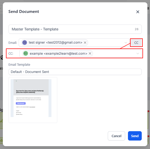 - Configure CC Recipients: Include CC recipients when finalizing and sending documents. First, toggle on Configure CC Recipients, in the dropdown, then select the contact you want to CC. The global CC settings will be applied to:Templates.Individual documents.Public documents.