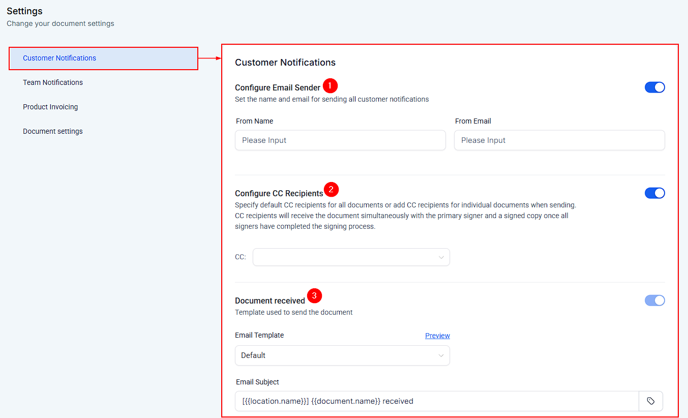 Document Signed: Toggle the Document Signed button to send a notification to the customer when the document has been successfully signed.