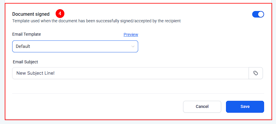 - Document Signed: Toggle the Document Signed button to send an internal notification when the document has been successfully signed/accepted by the recipient.Email Template: Choose the email template you want to be sent when a document is received from the drop-down menu.Email Subject: Summarize the main point of your email.