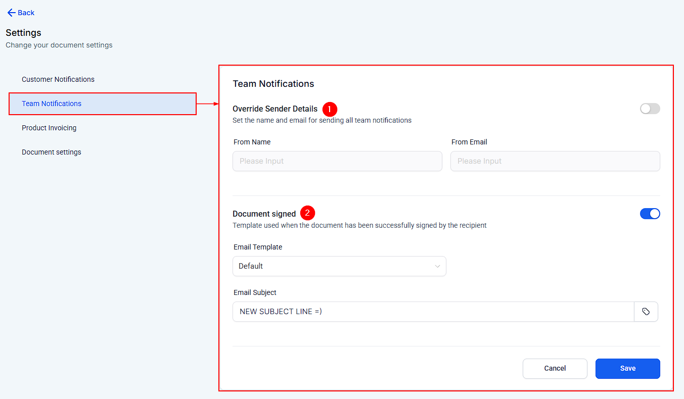 - Override Sender Details: Enter the name and email from which all team notifications should be sent.