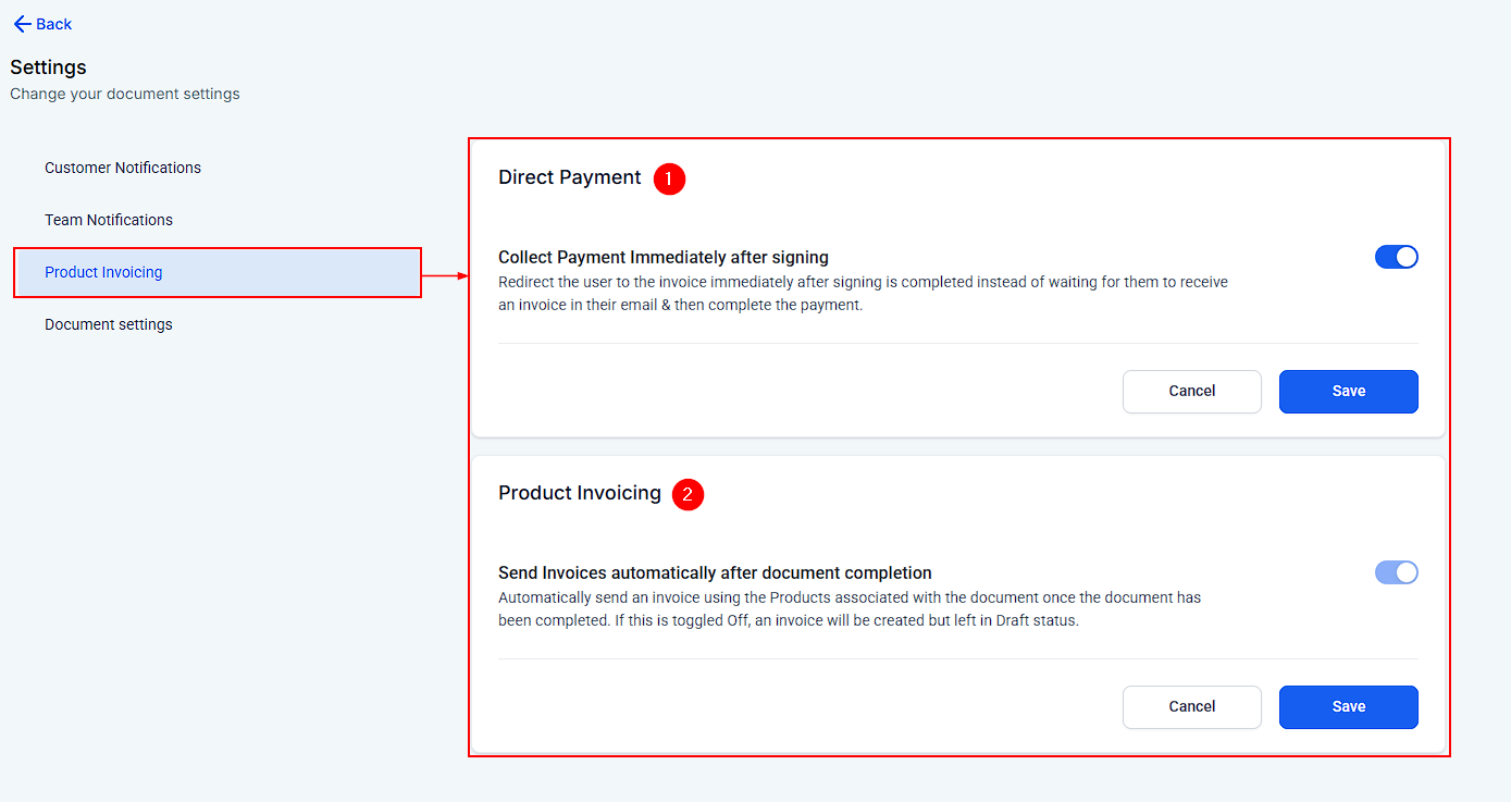 - Product Invoicing: This is automatically toggled on when Direct payment is toggled off. It allows invoices to be generated and delivered to the client upon the completion of the document. By default, the toggle is turned off, meaning the invoice will be created but not sent to the customer for payment.