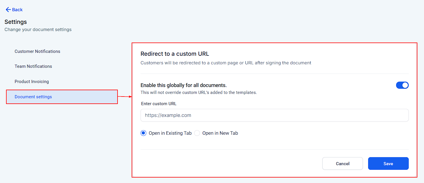 This setting allows users to automatically send customers to a specific webpage after signing a document. Users can enable redirection globally for all documents or configure it per template. A custom URL can be entered, and users can choose whether the link opens in the existing tab or a new one. This ensures a seamless client experience, guiding them to a thank-you page, next steps, or any relevant destination.