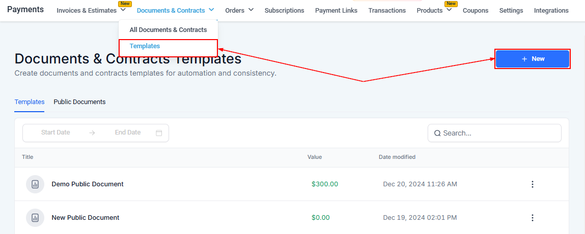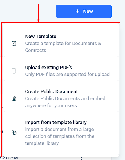 Click on New Template to create a template from scratch, upload an existing PDF of your choice, create a Public Document, or Import from Template Library.