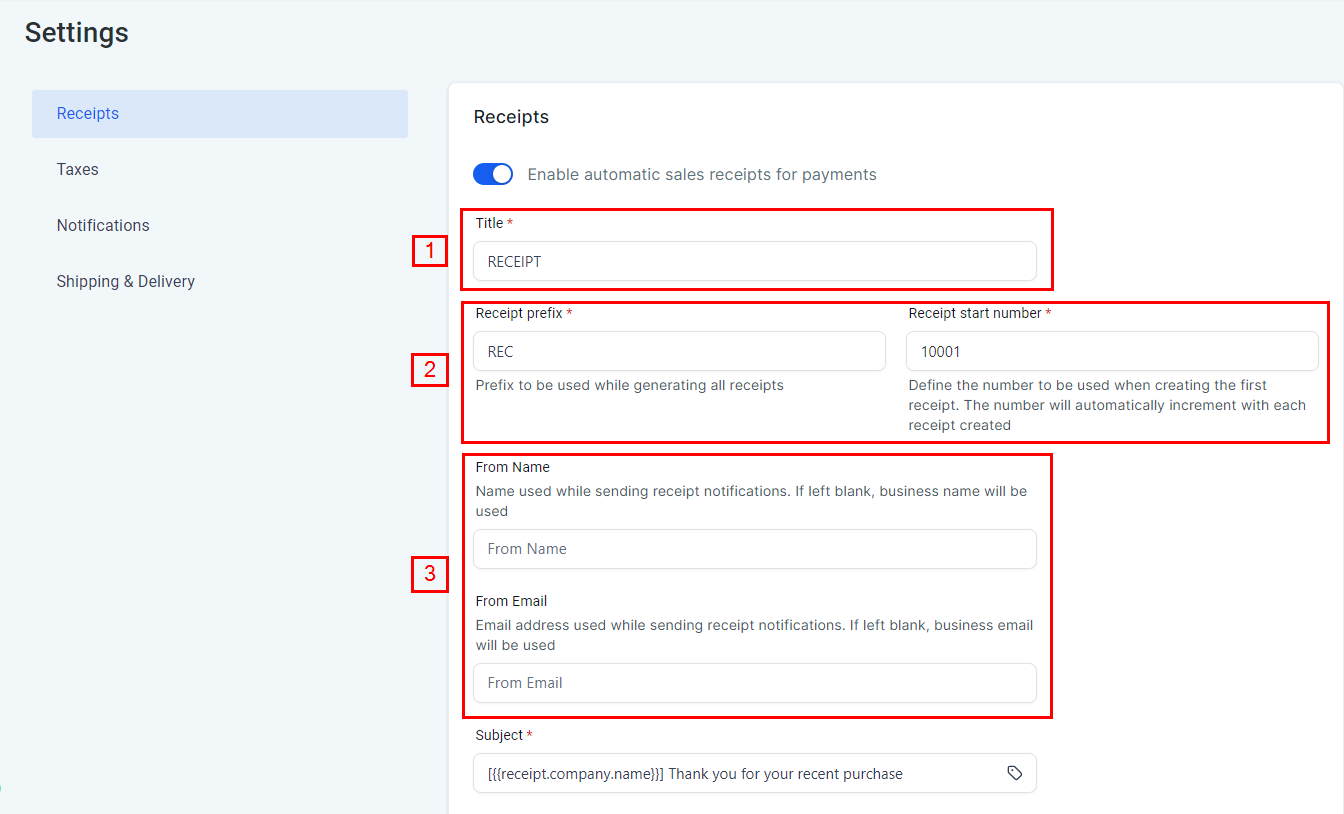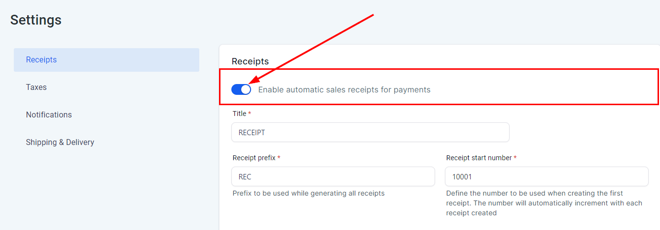 - Enabling Automatic Receipts is simple. Access the Settings page under the Payments menu, navigate to the Receipts section, and turn the toggle on to enable automatic receipts.