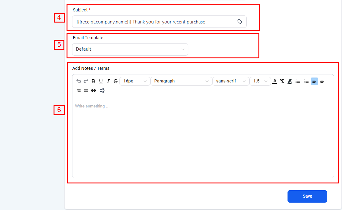 4. Subject: Create a captivating subject line using custom values for enhanced personalization. This will empower business owners to have more control over how receipts are sent out.