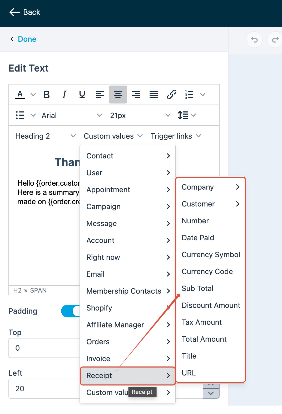 You can create personalized and branded templates with receipts using custom values available within our email builder. This allows you to craft visually appealing and professional receipts that align with your business's unique style.