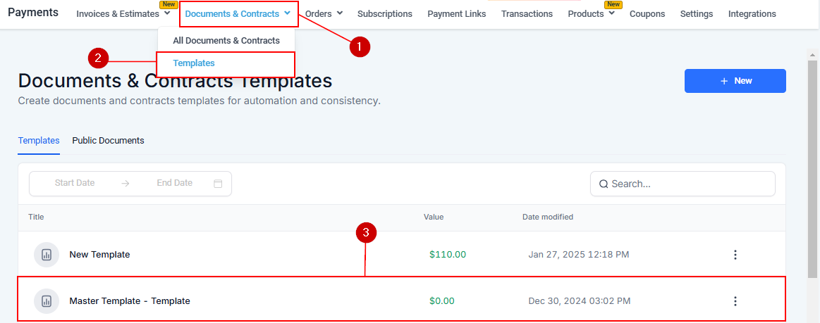 To access the Builder, navigate to the Documents & Contracts Templates section within your account. From there, you can create a new template or select an existing one to begin. Alternatively, select a drafted template in the All Documents & Contracts category. We will use an existing template in this guide.