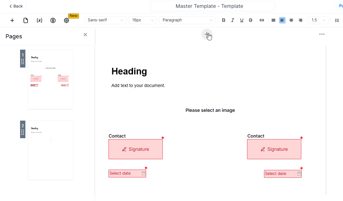 Select the "+" button to add a page before or after the current page.