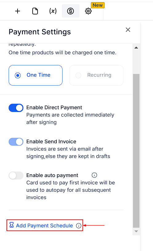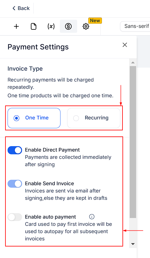 This section allows you to manage payment and invoicing for your document. Choose whether you want to add a One-time or Recurring Invoice. Enable "Direct Payment" to collect payments immediately after signing and toggle "Send Invoice" to email invoices upon signing; otherwise, they remain in drafts. When Auto Payment is enabled, the card used for the first payment will be automatically charged for all subsequent payments.