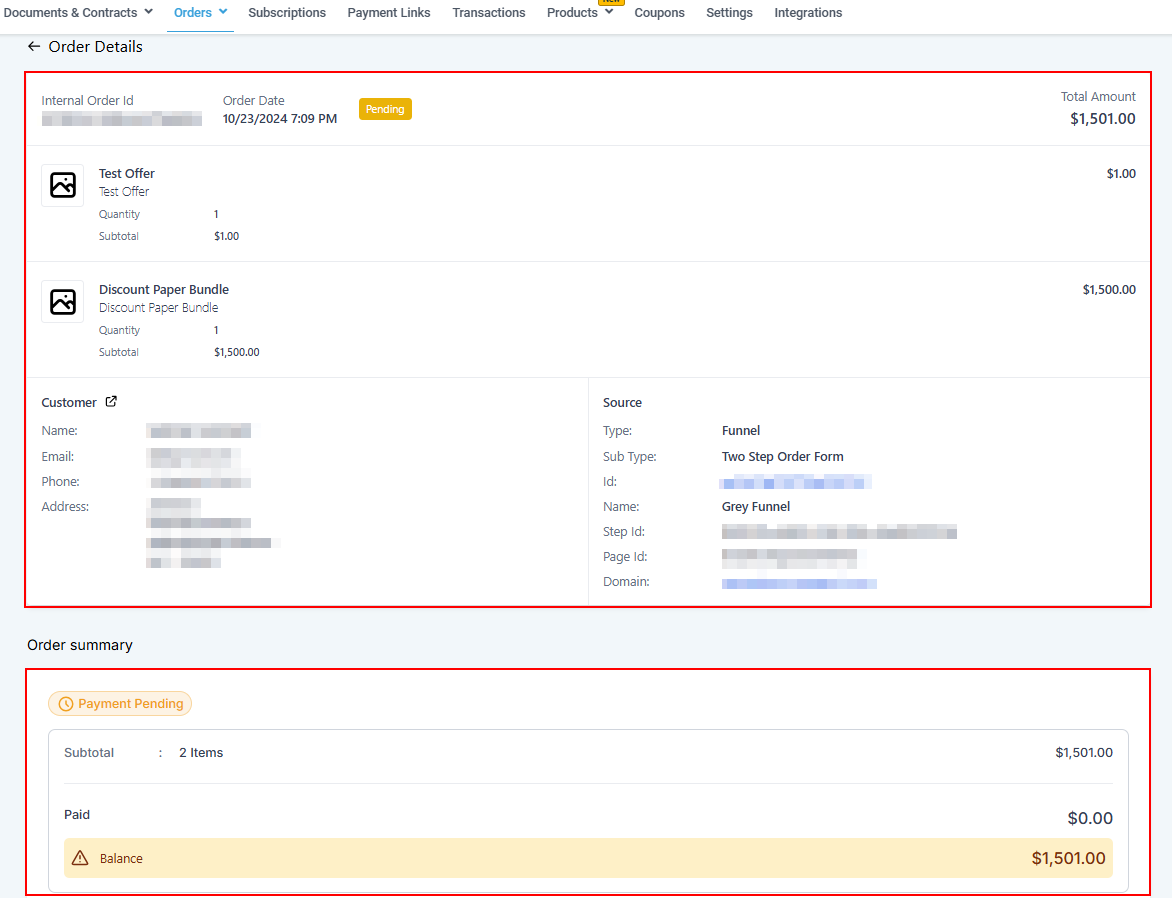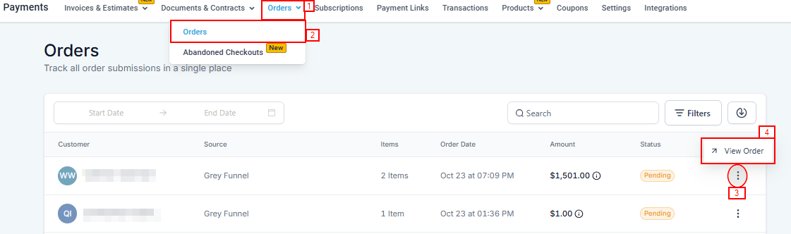 To see the details of the orders, access the Payments section from the left navigation menu. Select the Orders dropdown and click on Orders. Click on the three dots of the required order and select View Order.