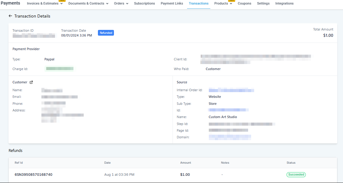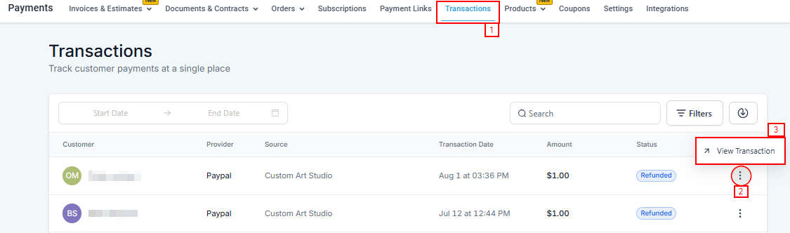 Access the Payments section from the left navigation menu again. Select the Transactions tab. Click on the three dots of the required transactions and select View Transaction.