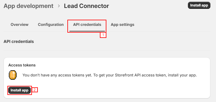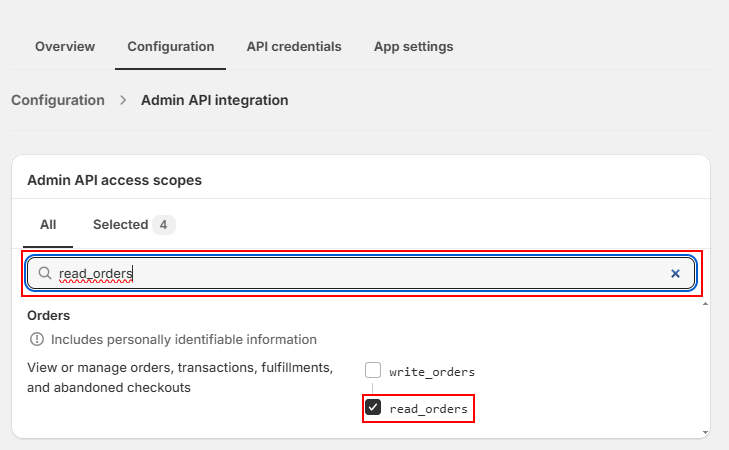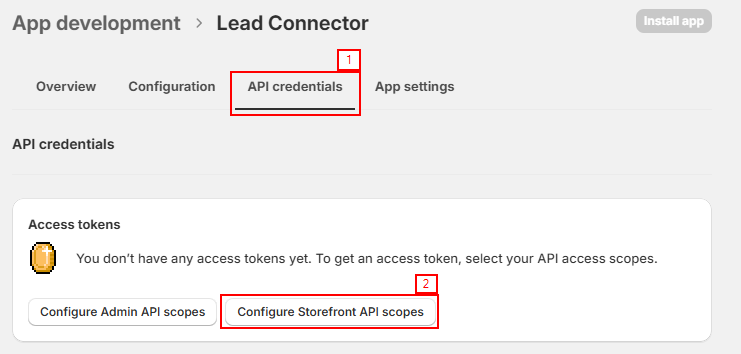 Navigate to the API Credentials tab and click on Configure Storefront API scopes.