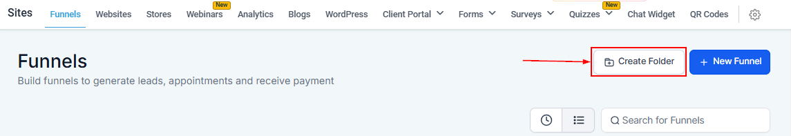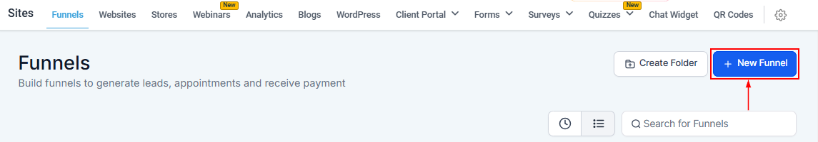 To get started, navigate to the Sites section in your CRM, and Click on the Funnels tab.