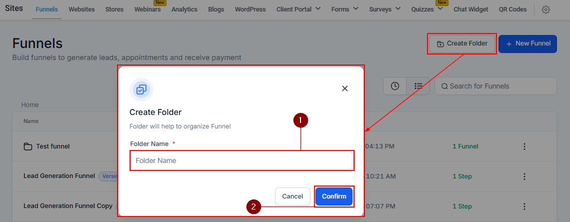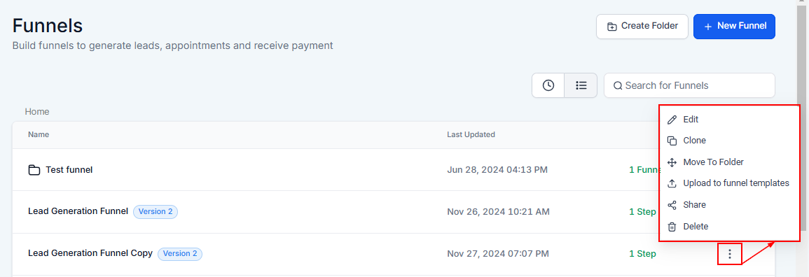 - Move To Folder: If you have folders created in your funnel section, you can move a funnel across folders.