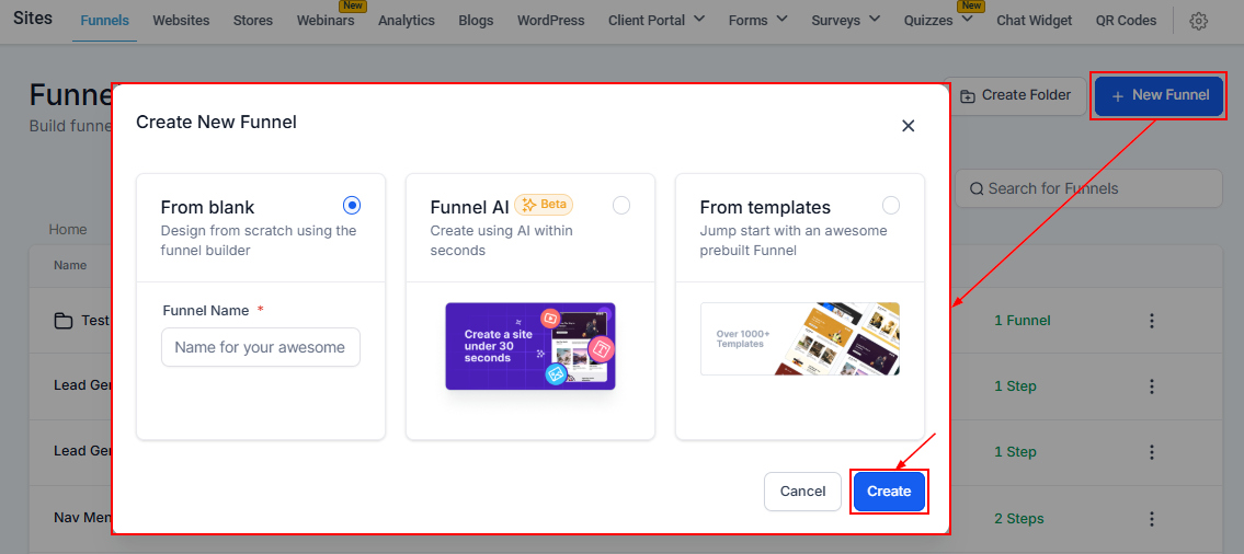 You can choose between creating a funnel “From blank, using Funnel AI, or From templates.” Name the funnel, which will be saved once you hit the "Create" button.