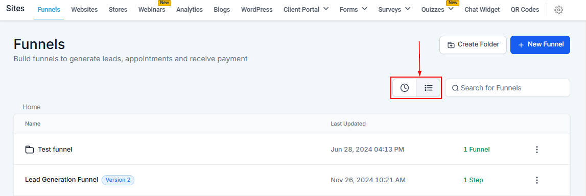 You can sort your funnel list by the most recent updates or in alphabetical order. The Recent option (clock icon) shows the latest updates at the top, while the List view organizes funnels by folders, followed alphabetically.
