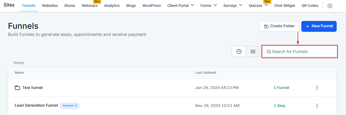 If you have a long list of sales funnels, searching by name may be faster than scrolling to find the particular funnel you're looking for.
