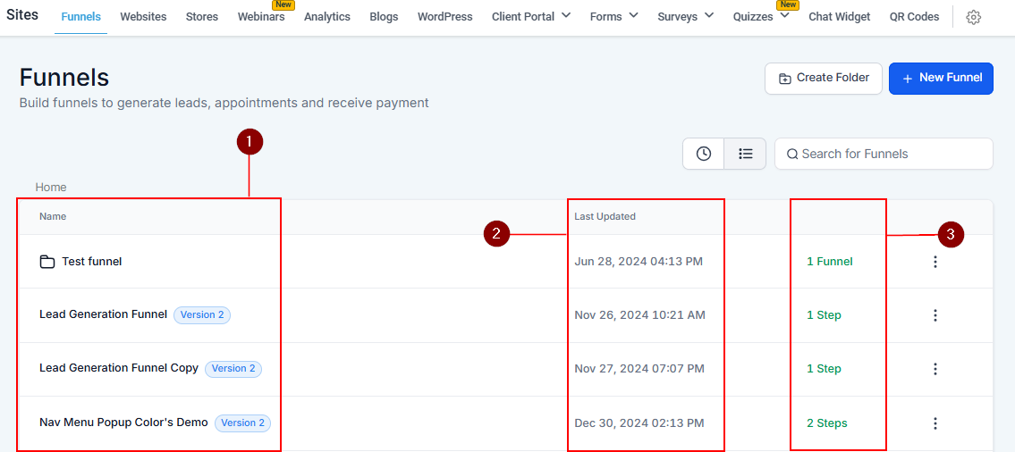 - Steps within the Funnel: You can also see how many total steps are inside each funnel.