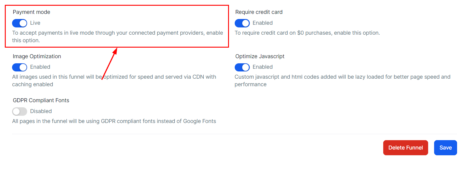The payment status of the funnel is determined by the payment mode. If you're testing payments, toggle "Payment Mode" Off, so that transactions will be for test purposes and won’t process any real payments. Once you toggle it "On," the funnel will go live, and all payments will be processed as real transactions.