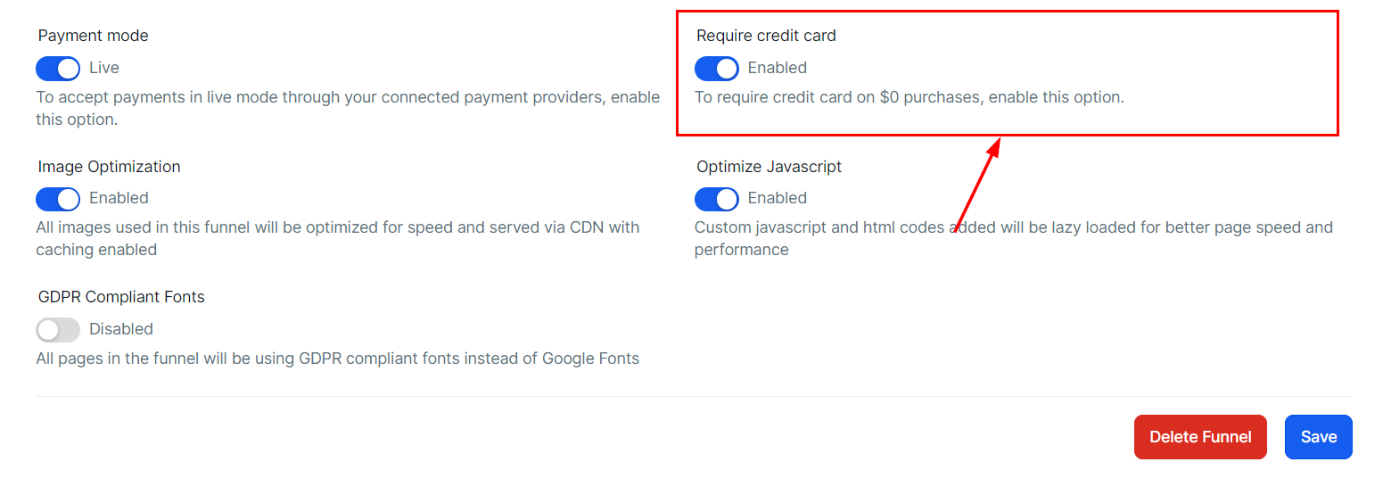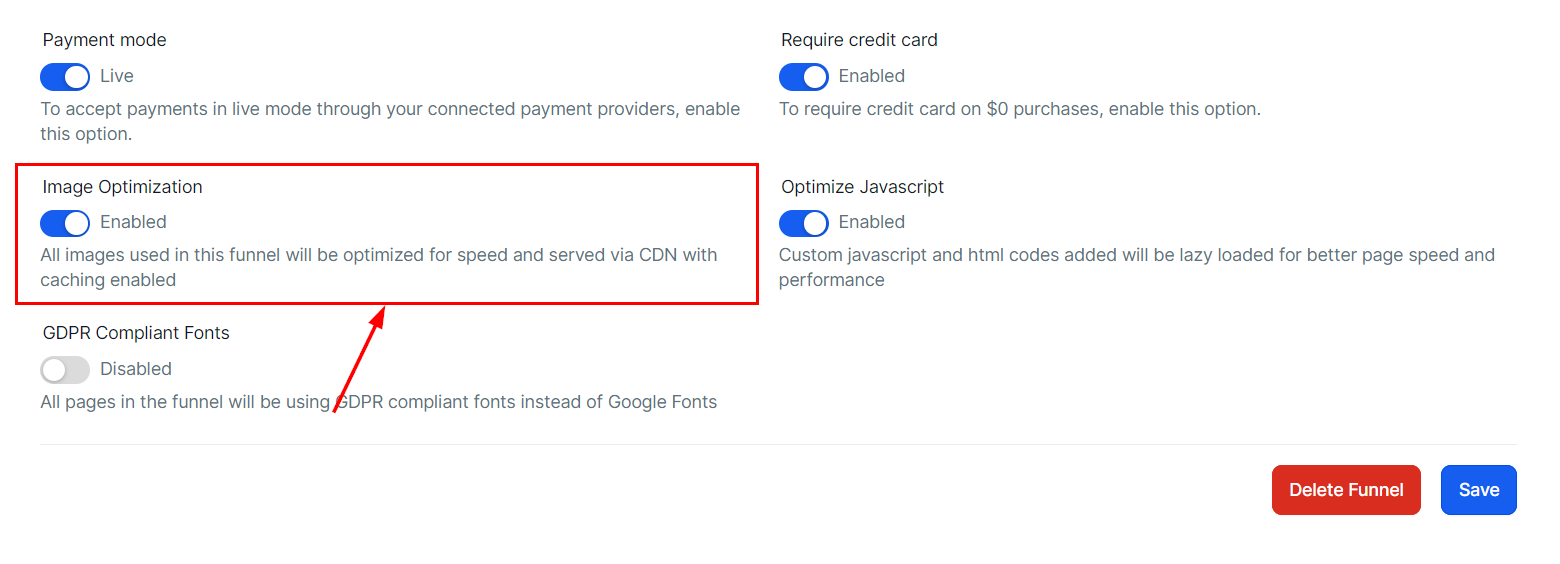 Enable this option to optimize all images added to the funnel for performance. These images will be delivered through a CDN with caching enabled, ensuring faster load times.
