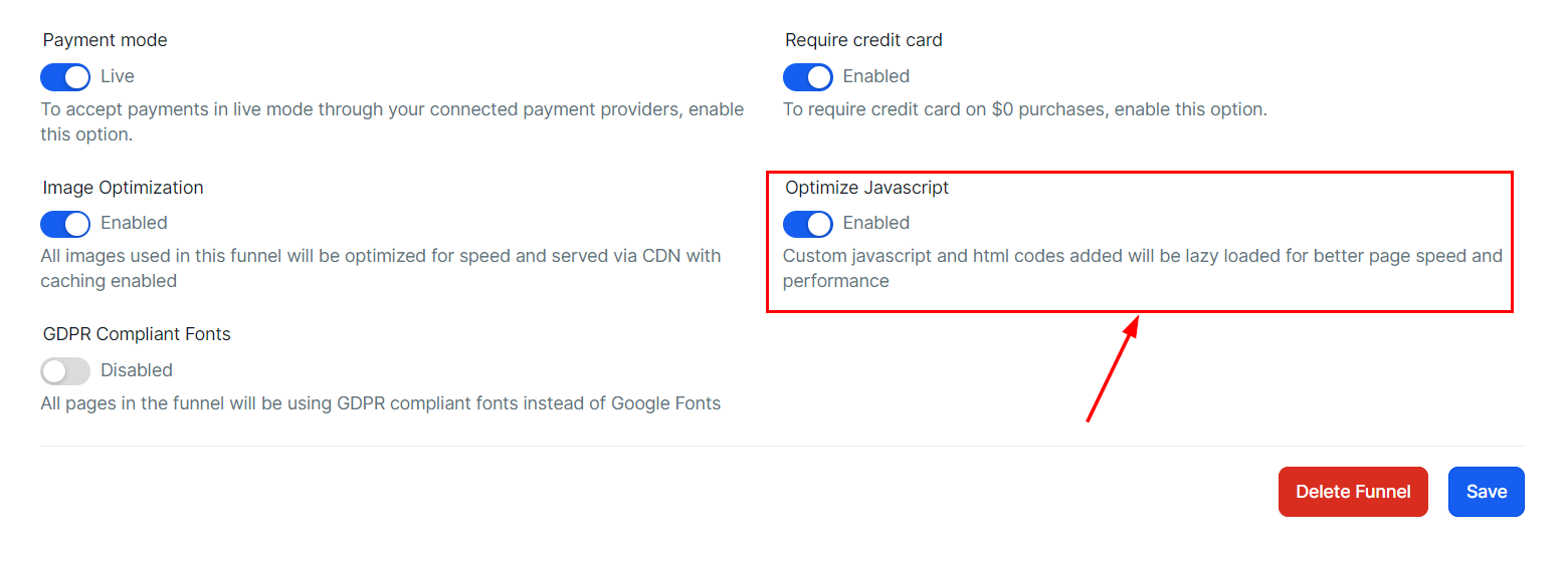 When enabled, custom JavaScript and HTML code added to the funnel will be lazy-loaded to enhance page speed and overall performance.
