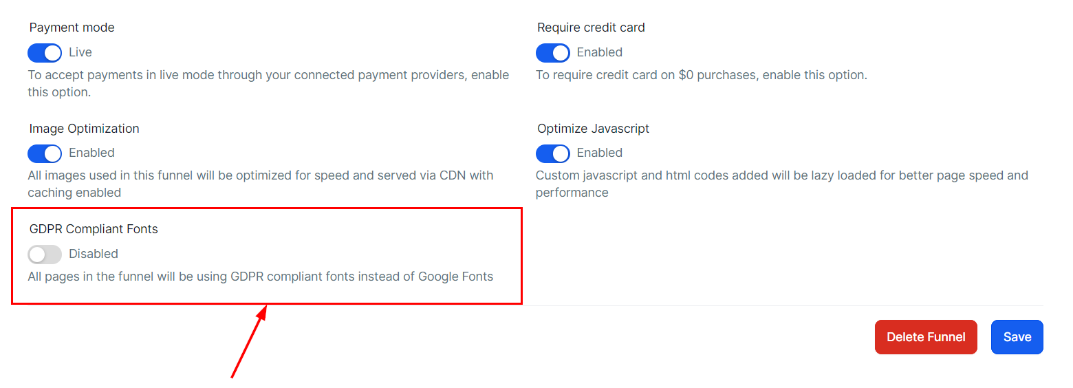 If this option is enabled, the fonts used in the funnel will be GDPR Compliant fonts instead of Google Fonts.