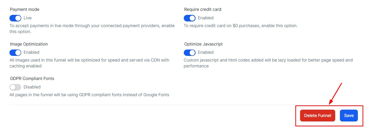 Lastly, you can delete the entire funnel, or save the changes you made to the funnel settings by clicking the respective option.