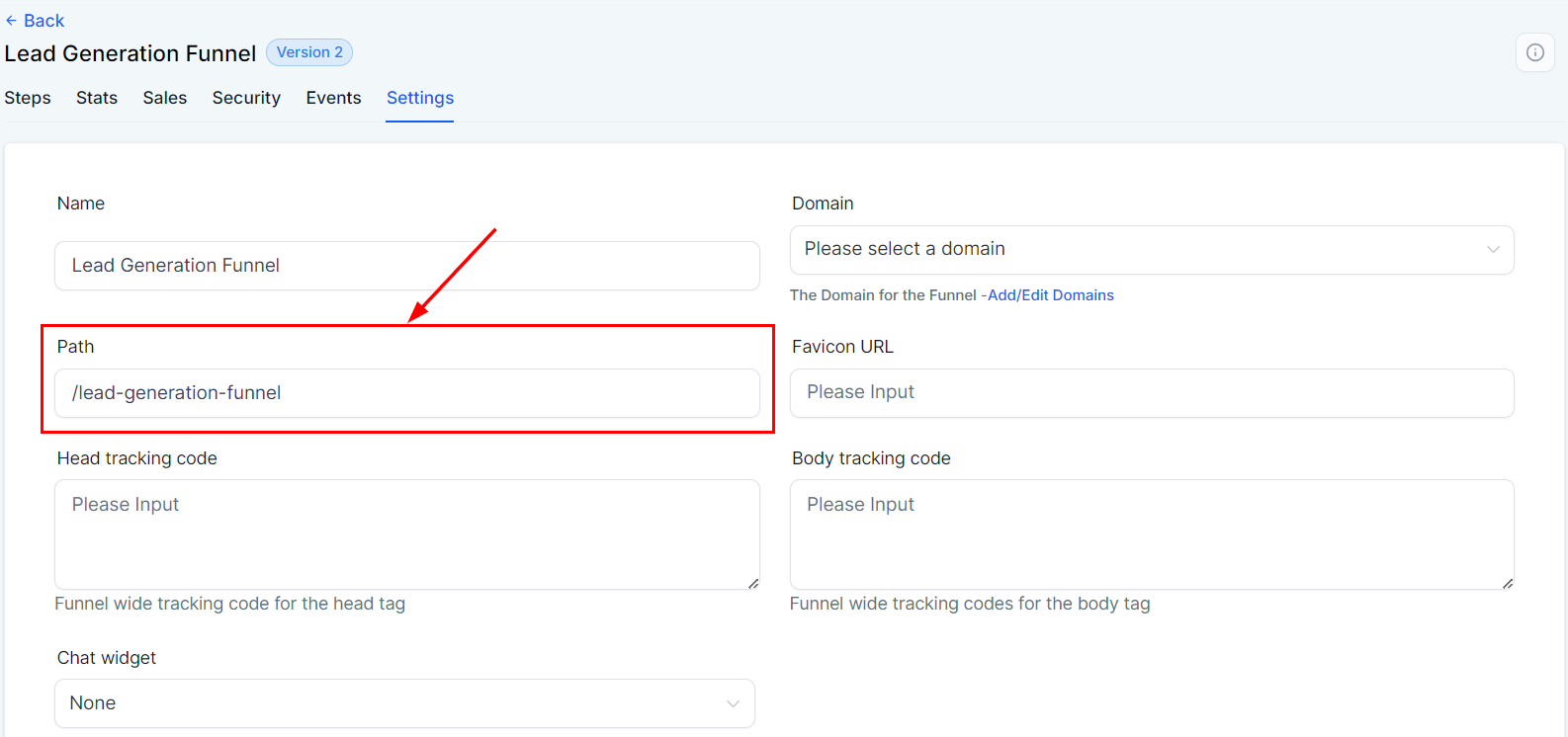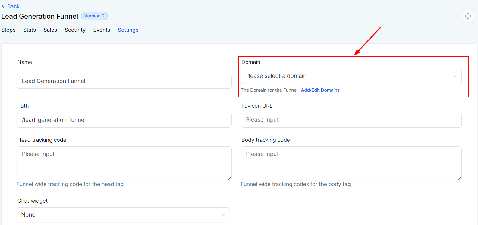 In the "Domain" field, select the domain you wish to associate with this funnel. This is essential, as the funnel cannot be live without an assigned domain.