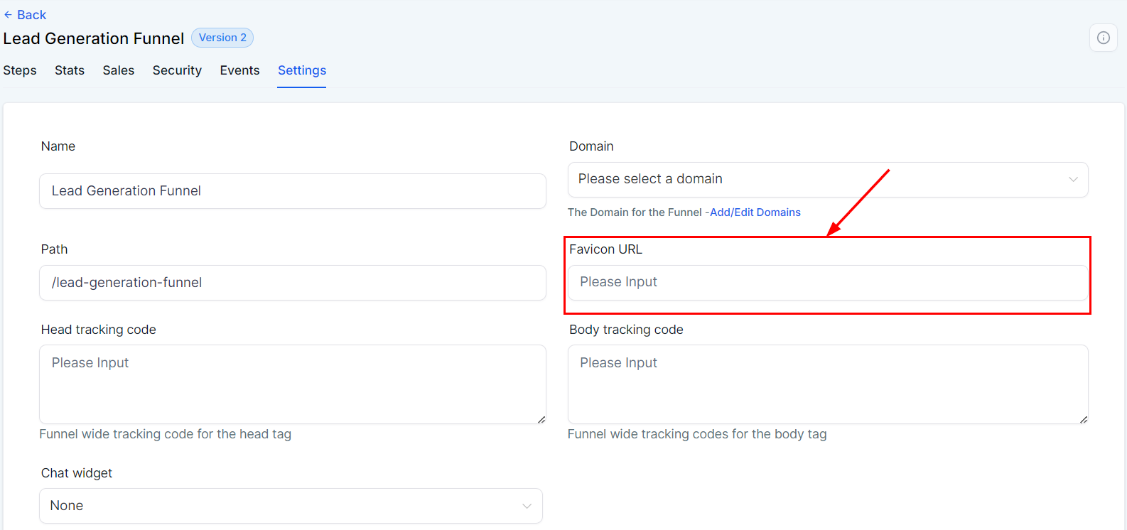 The favicon is the small icon or logo, typically representing your business, displayed in the browser tab. To add a favicon to your funnel, paste the favicon URL (.png or .ico) in the designated field. This will apply the favicon to all pages within the funnel.