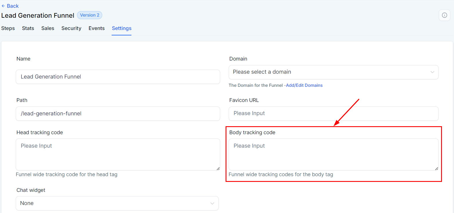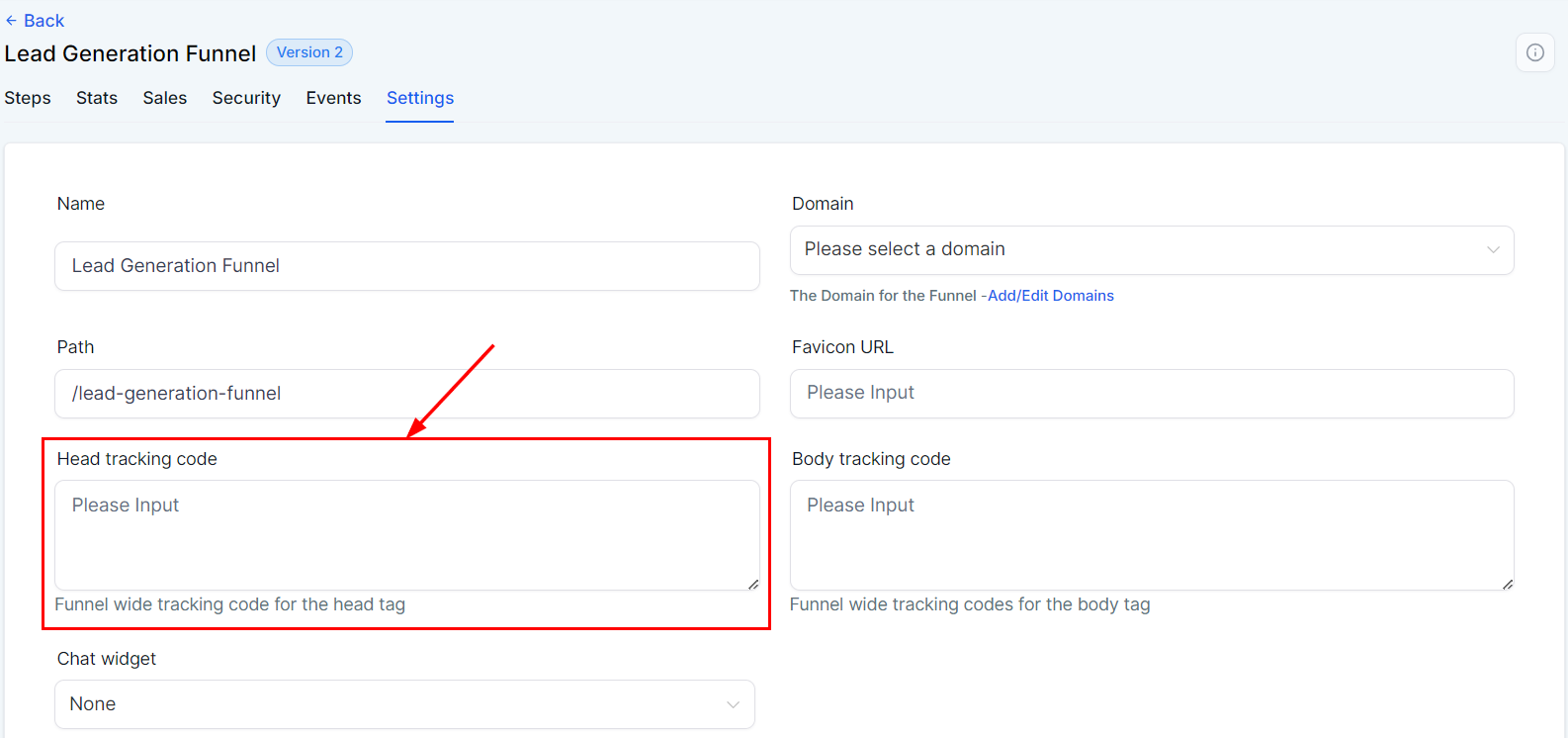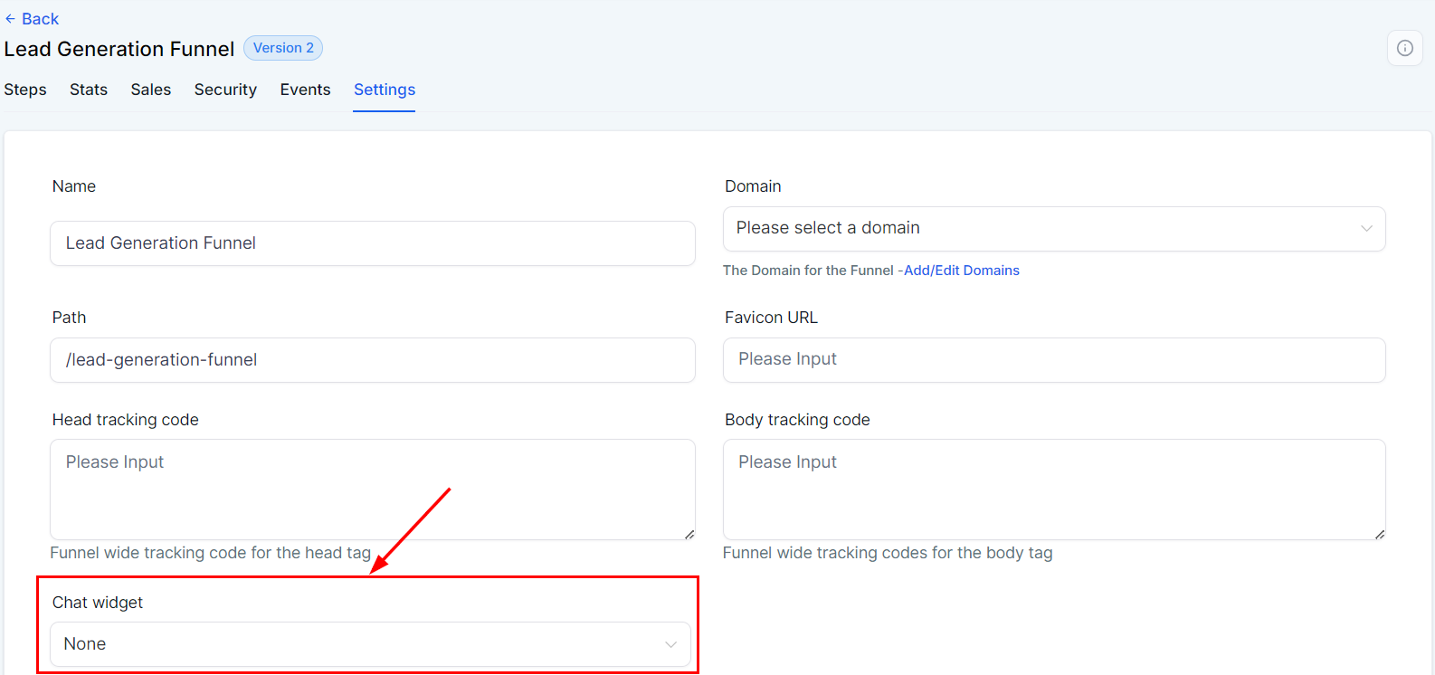 To enable the chat widget for this funnel, select the desired widget from the dropdown menu. The chat widget is particularly useful for lead generation funnels, as it consolidates conversations with leads into a single channel.