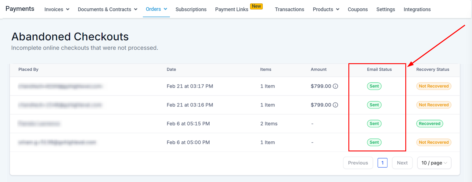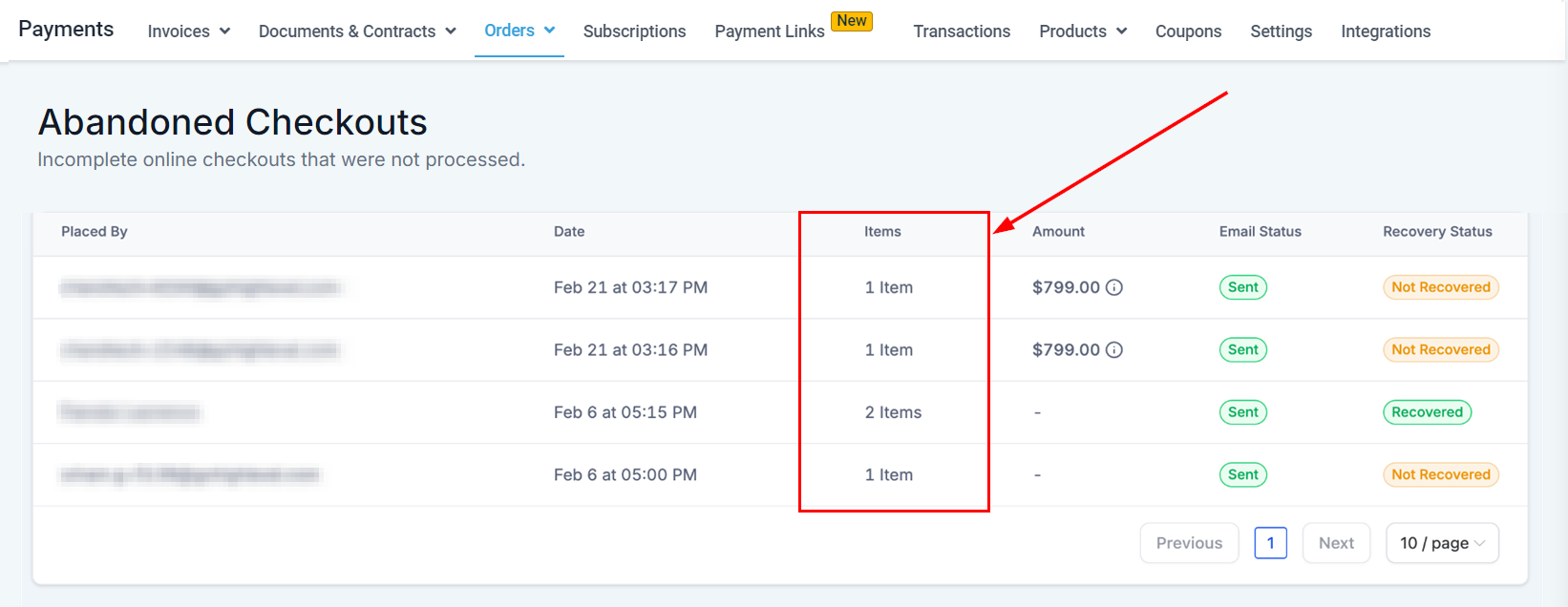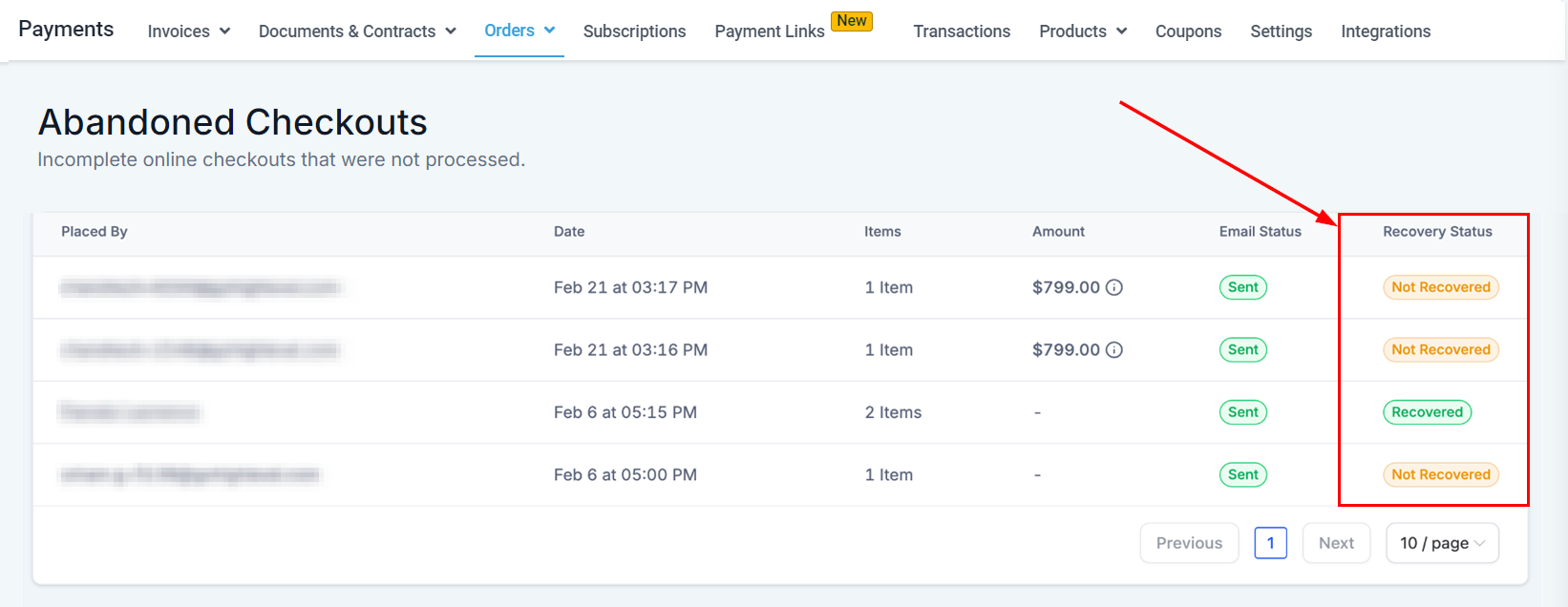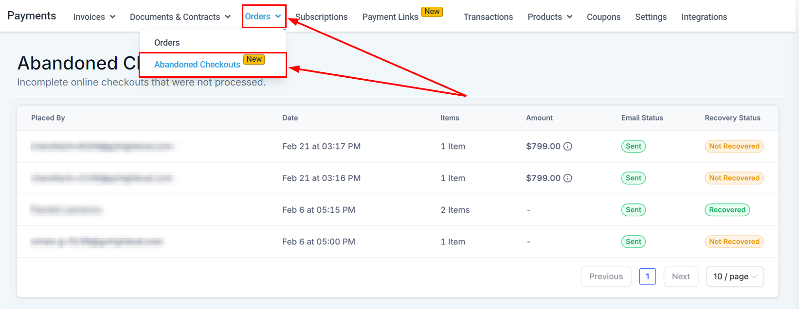 - Abandoned checkouts refer to transactions where a customer added items to their cart but did not complete the purchase. These are listed on the Orders page to help businesses track and recover these sales.