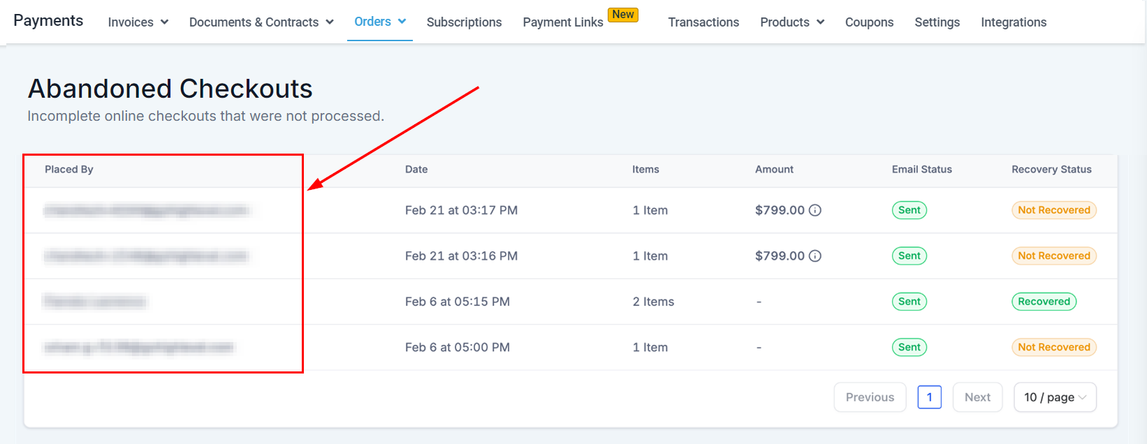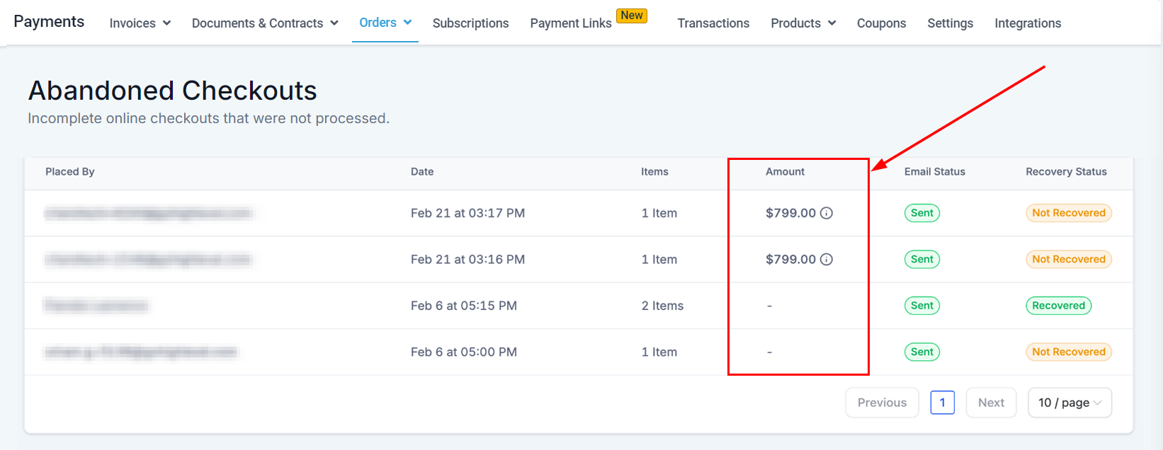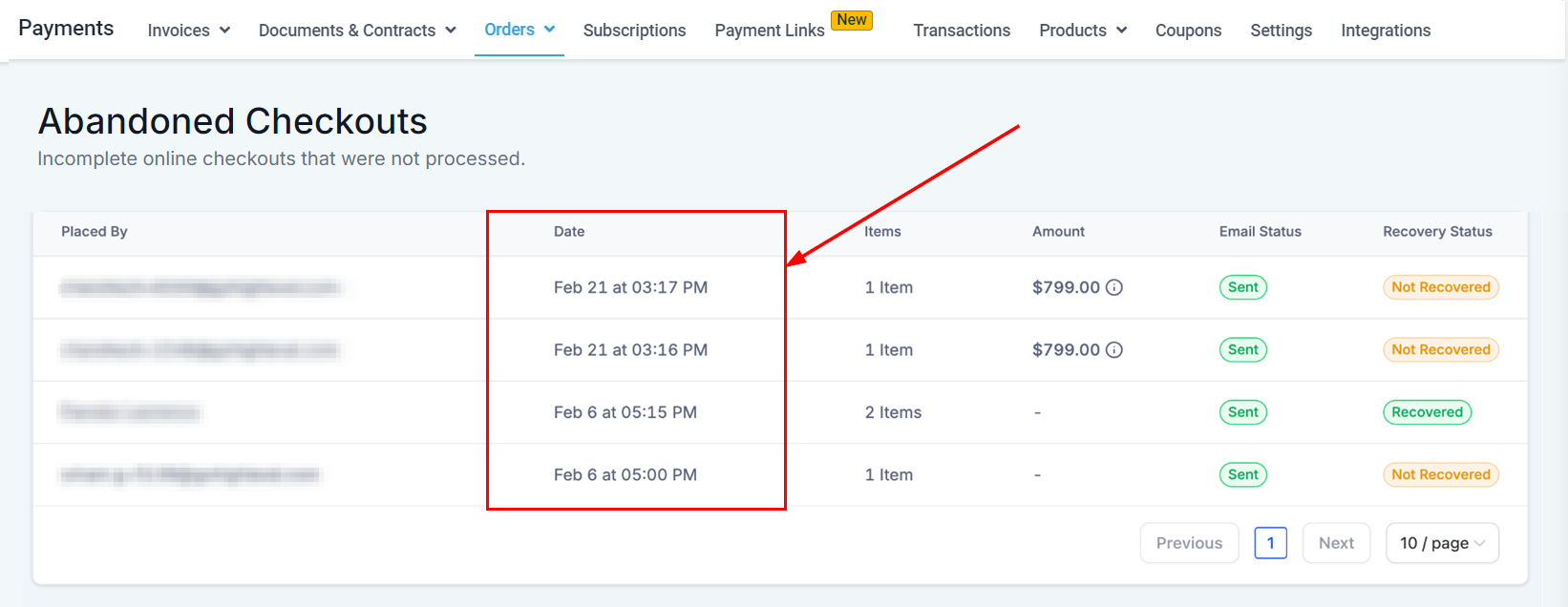 Abandoned checkouts are prominently listed on the Orders page, allowing business users to efficiently track and manage incomplete transactions. This capability provides detailed insights into customer activity and helps streamline efforts to recover lost sales.