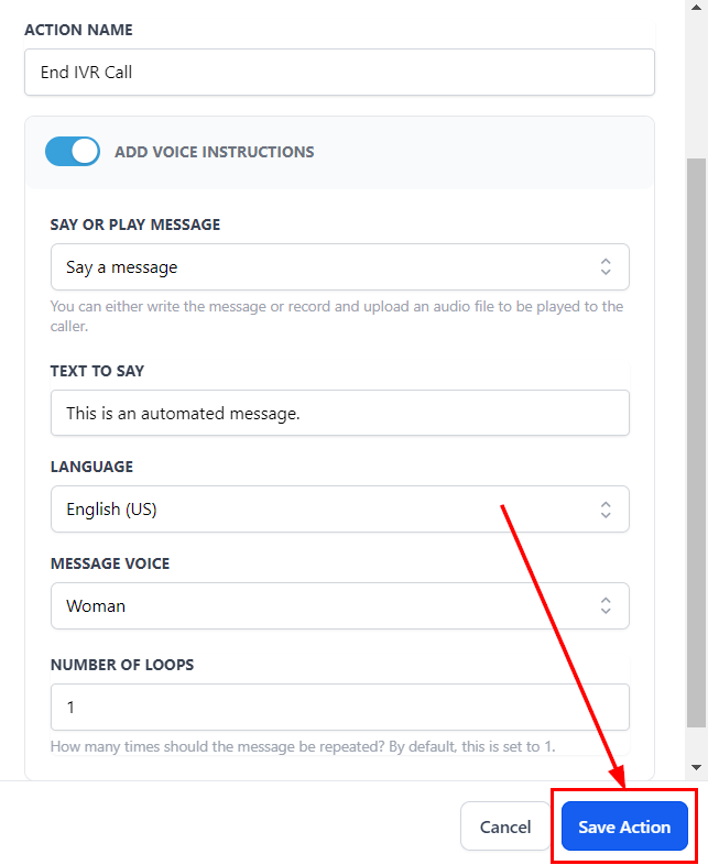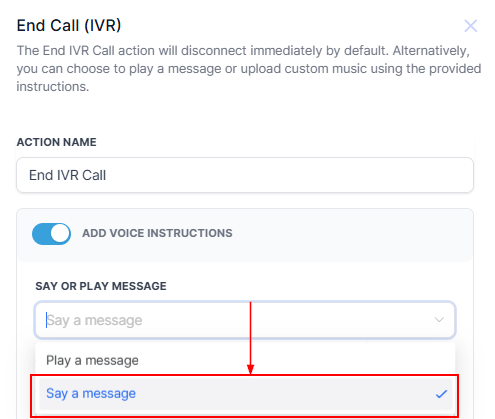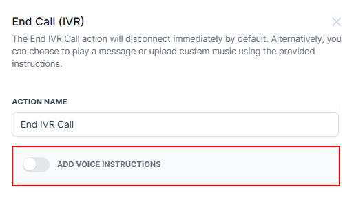 Terminate the IVR call instantly by saving the action with the “Add Voice Instructions” switch toggled off.