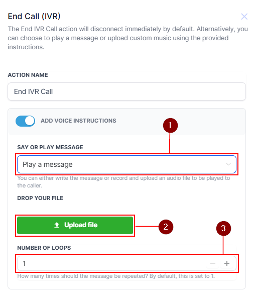 Upload a custom voice message or branded music to be played before terminating the call by using the “Play a Message” option from the Say or Play Message dropdown. This option allows you to set the number of loops.