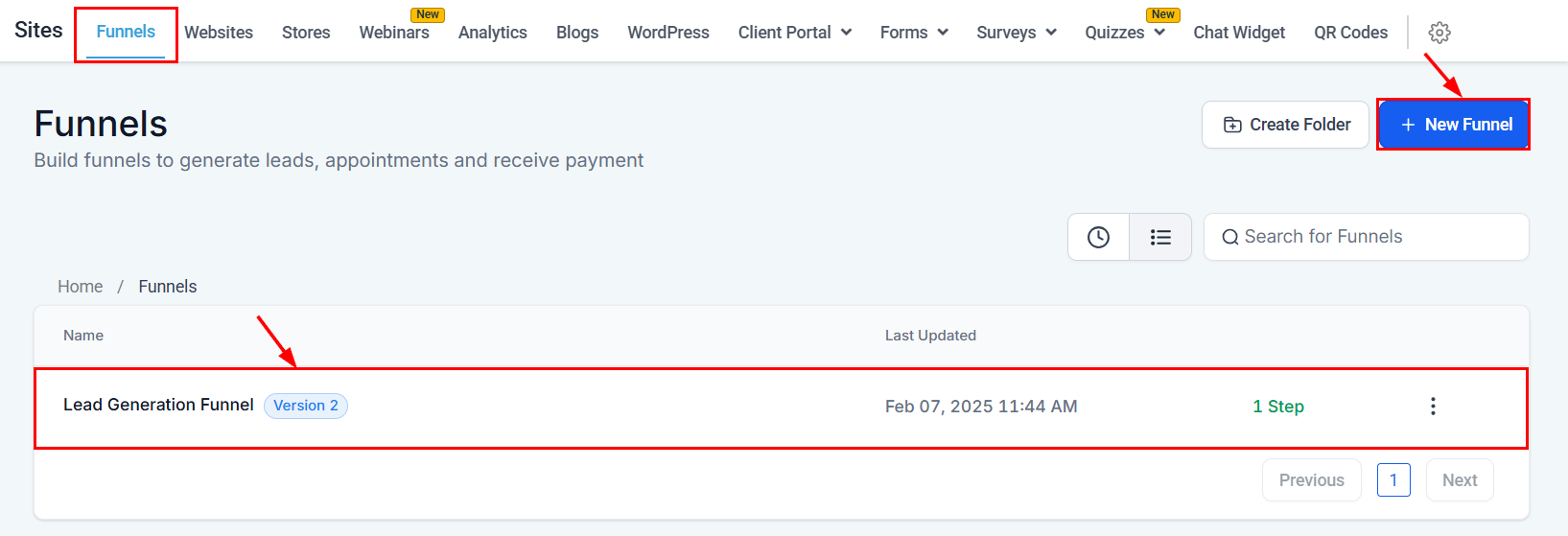 Navigate to the Funnels section in your account by clicking on the “Sites” menu on the left sidebar. Create a new funnel from scratch or using an existing template. If you already have a funnel you would like to personalize, open the funnel editor by clicking the name of the funnel.