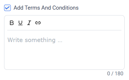 Add Terms and Conditions inside a text field by checking the box, allowing up to 180 characters including links. This will show at the bottom of the payment link underneath the pay button.