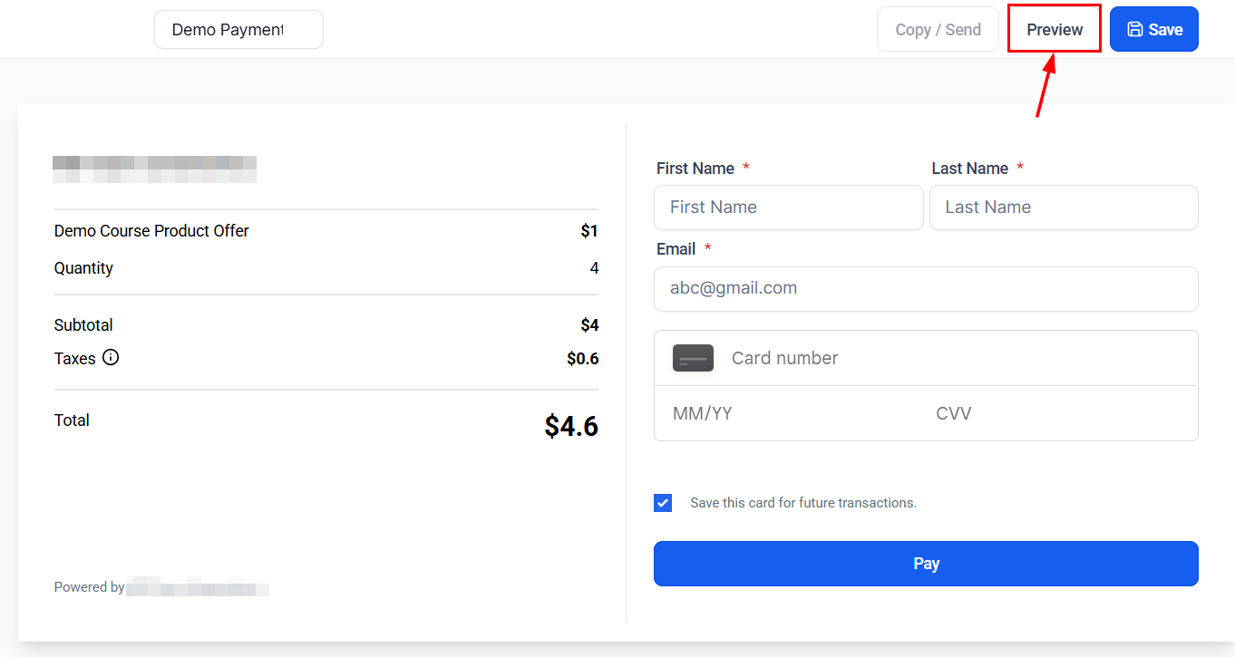 After setting up the link, a Preview will be available. Here, you can fill out the required fields and click on the 'CTA' button to simulate a purchase. This step ensures everything is set up correctly before sharing the link with customers.