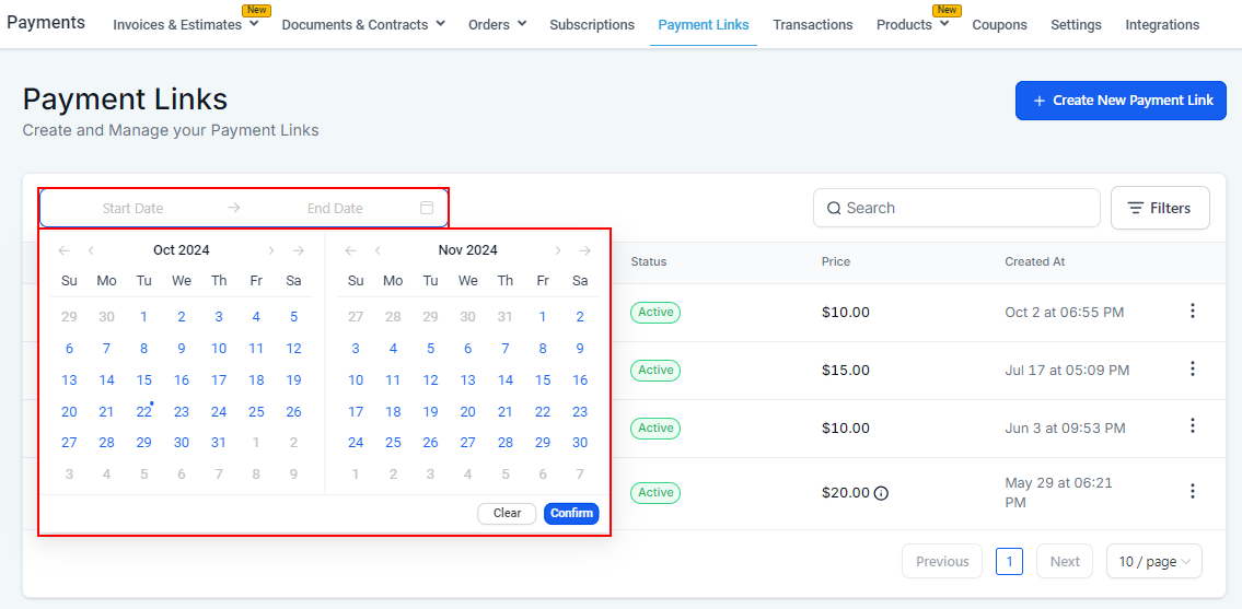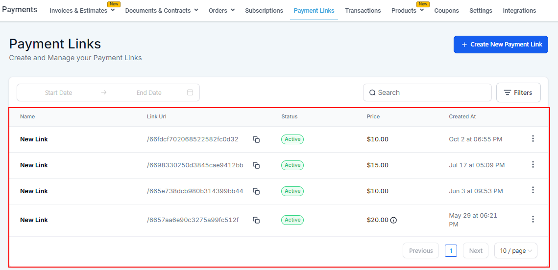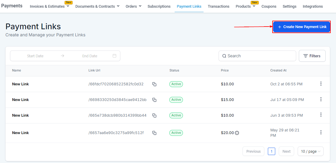 To begin creating a new payment link, you can select the + Create New Payment Link button on the top right.
