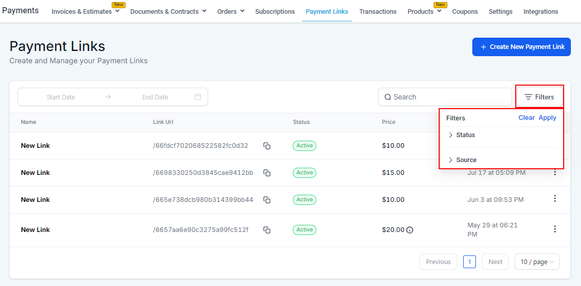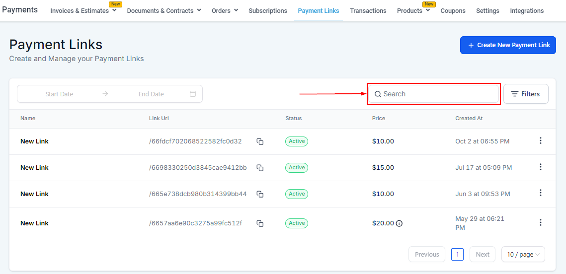 To find a specific payment link, use the search bar. You can search by payment link name.