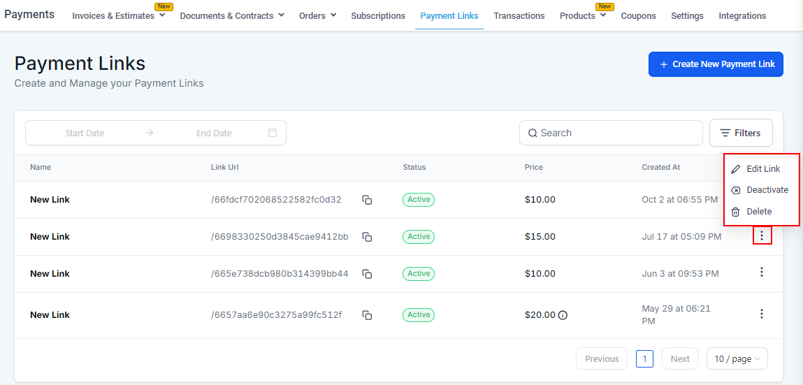 The three dots to the right allow you to edit, deactivate, and delete the chosen payment link.