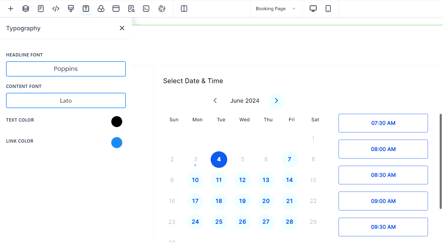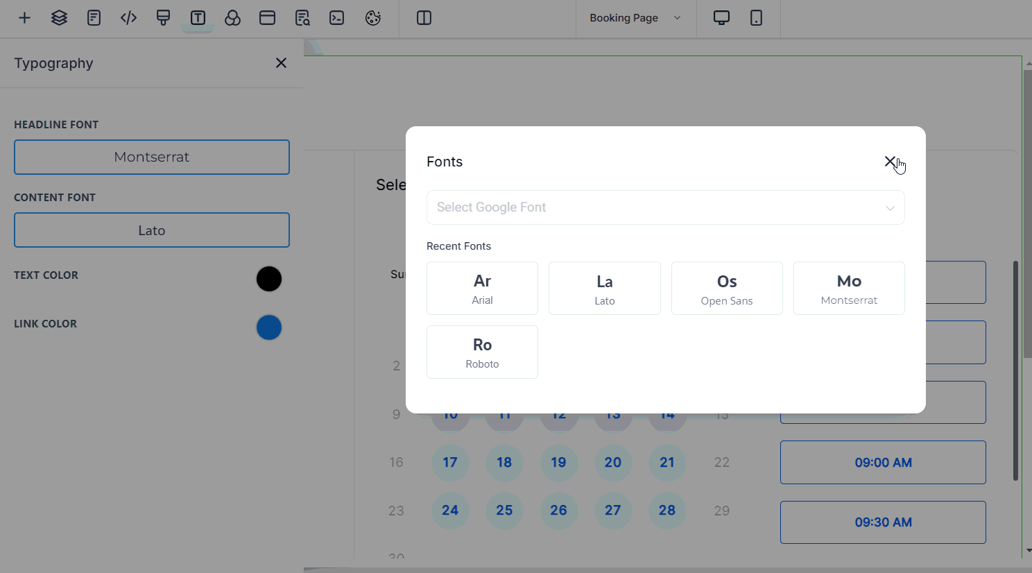 Go to the funnel you want to customize and locate the "Typography" Icon on the top left-hand corner of the funnel builder. This is where you can update fonts for various text elements.