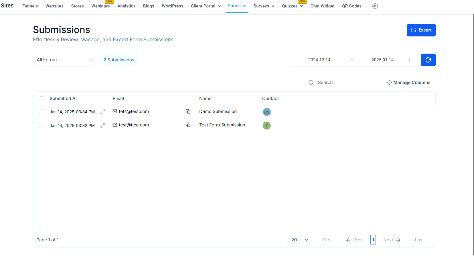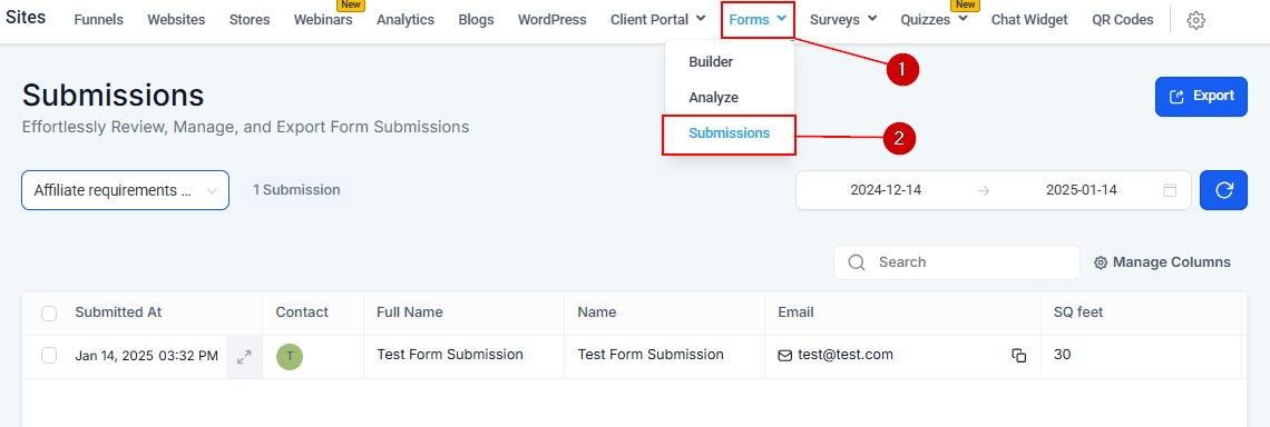 Navigate to the Form Submissions section within the Sites tab to get started with this feature.