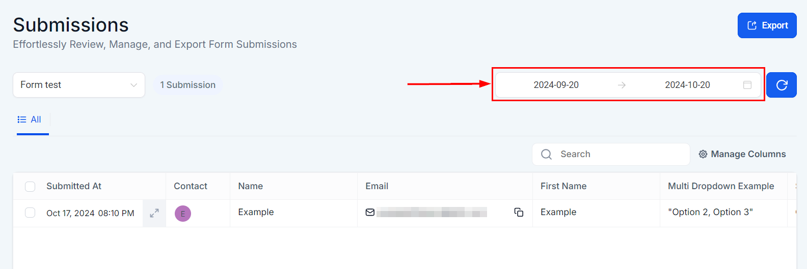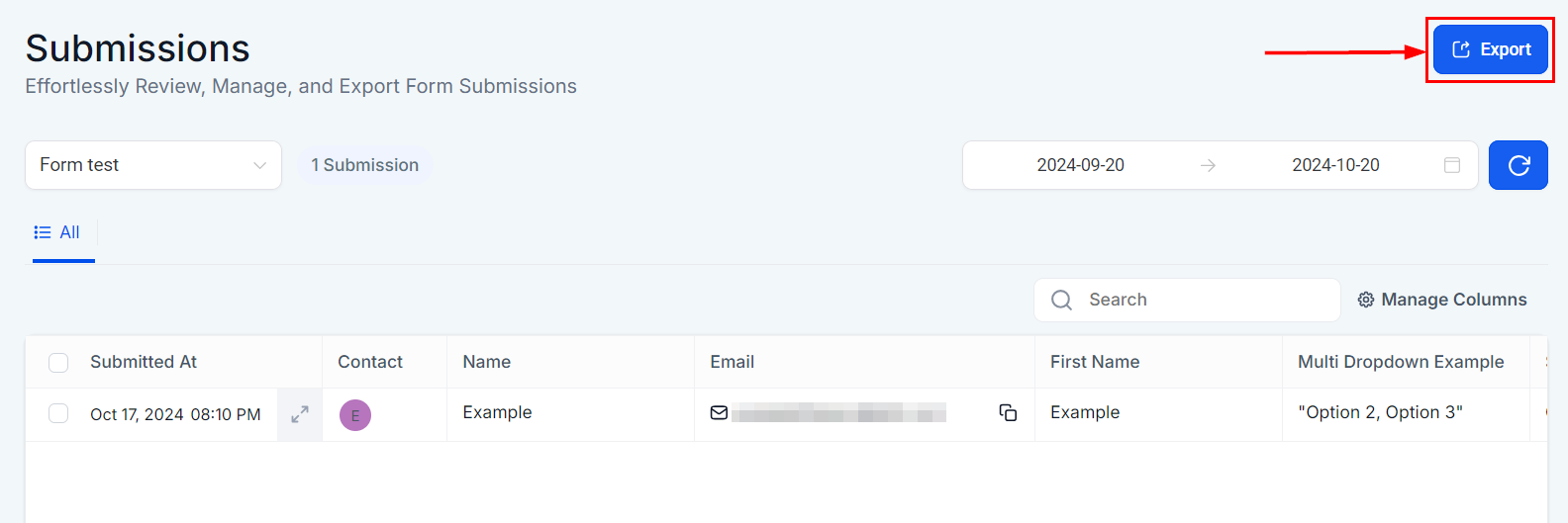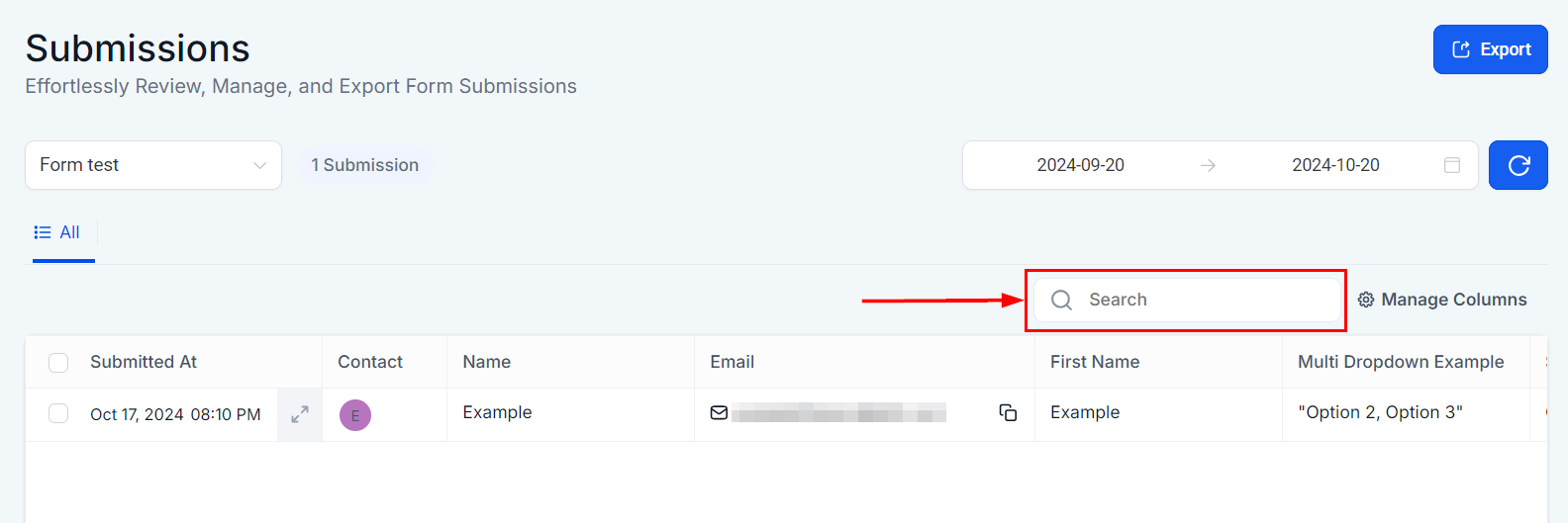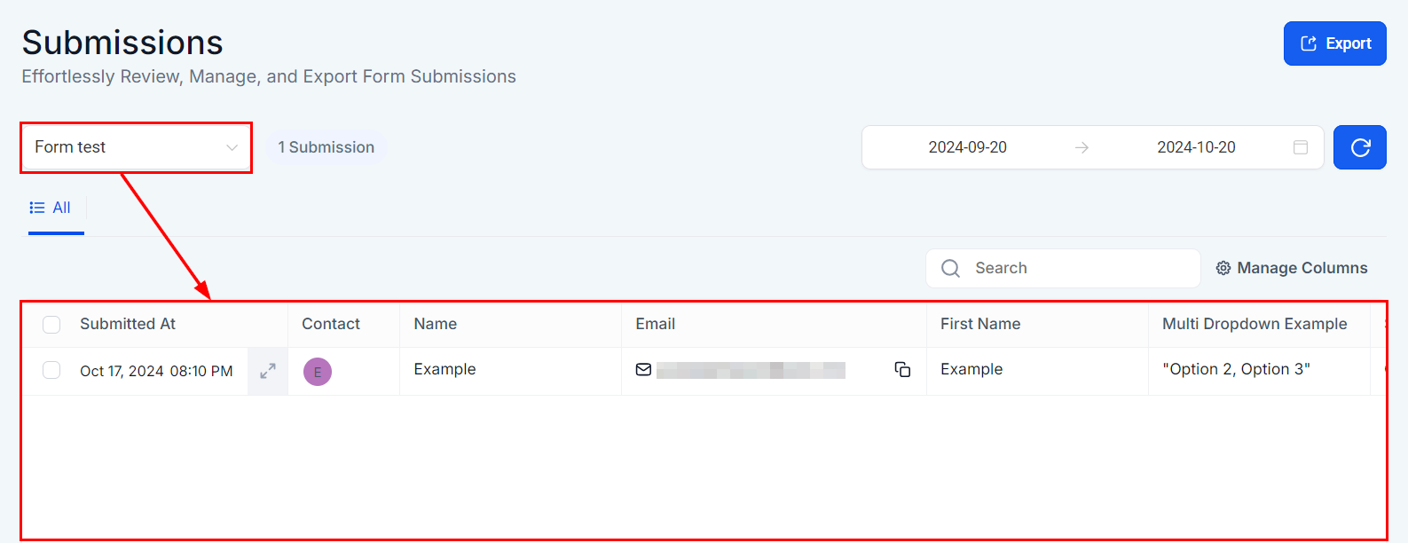 The Form Submission Table displays all submissions for a selected Form, or all Forms if no specific one is selected. Key submission details, such as the respondent's name, email, and submission date, are shown prominently for each entry unless the columns are adjusted.